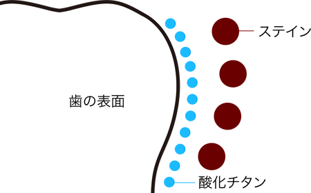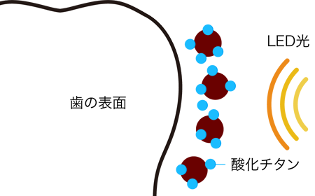 歯の表面に付着した汚れであるステインにホワイト溶液を塗布することで、ステインの周りに酸化チタンが吸着します。その状態で青色LEDを照射する事によって、歯の表面上で『光触媒』という化学反応を起こし無理なくステインを浮き上がらせます。